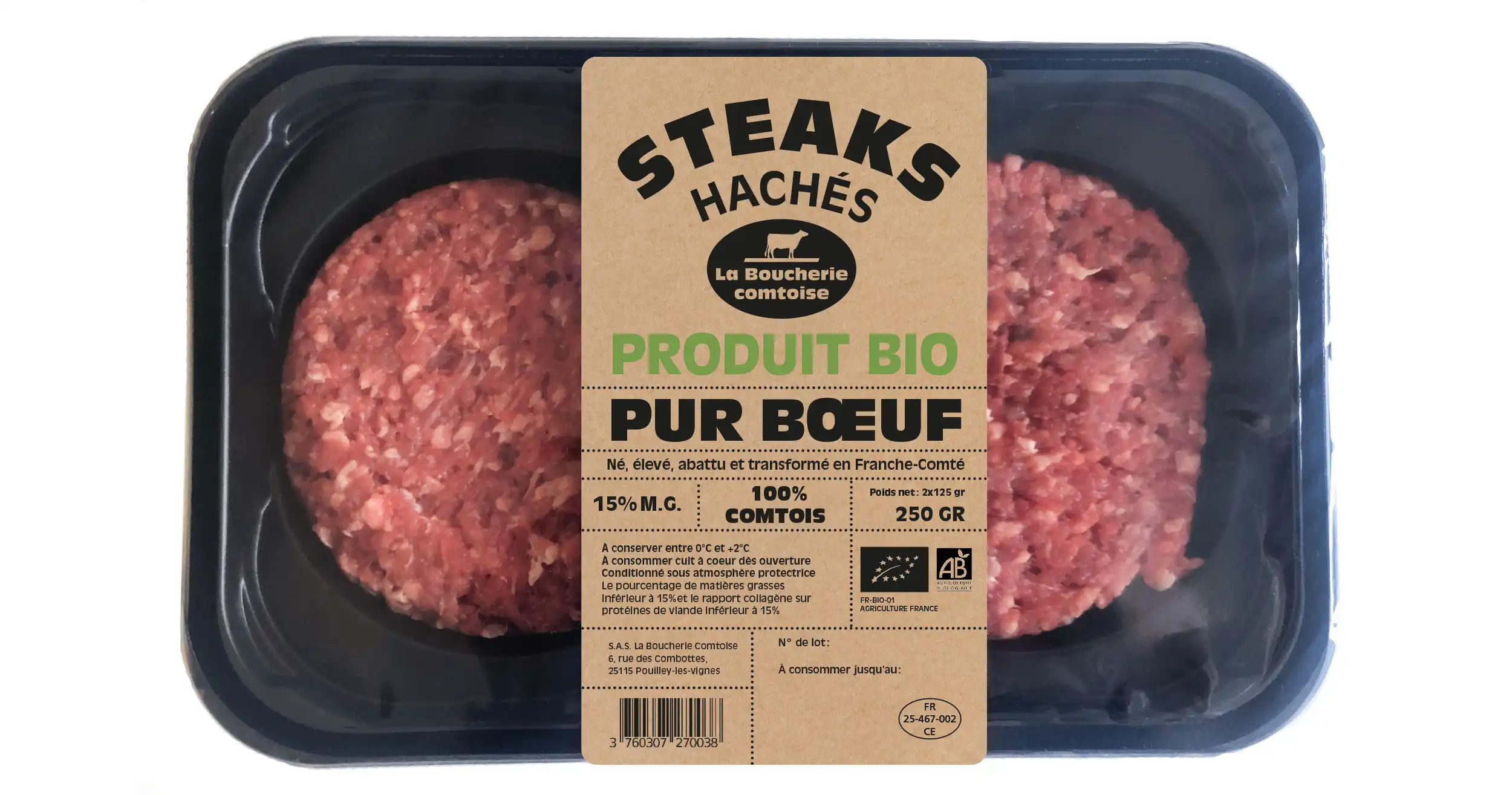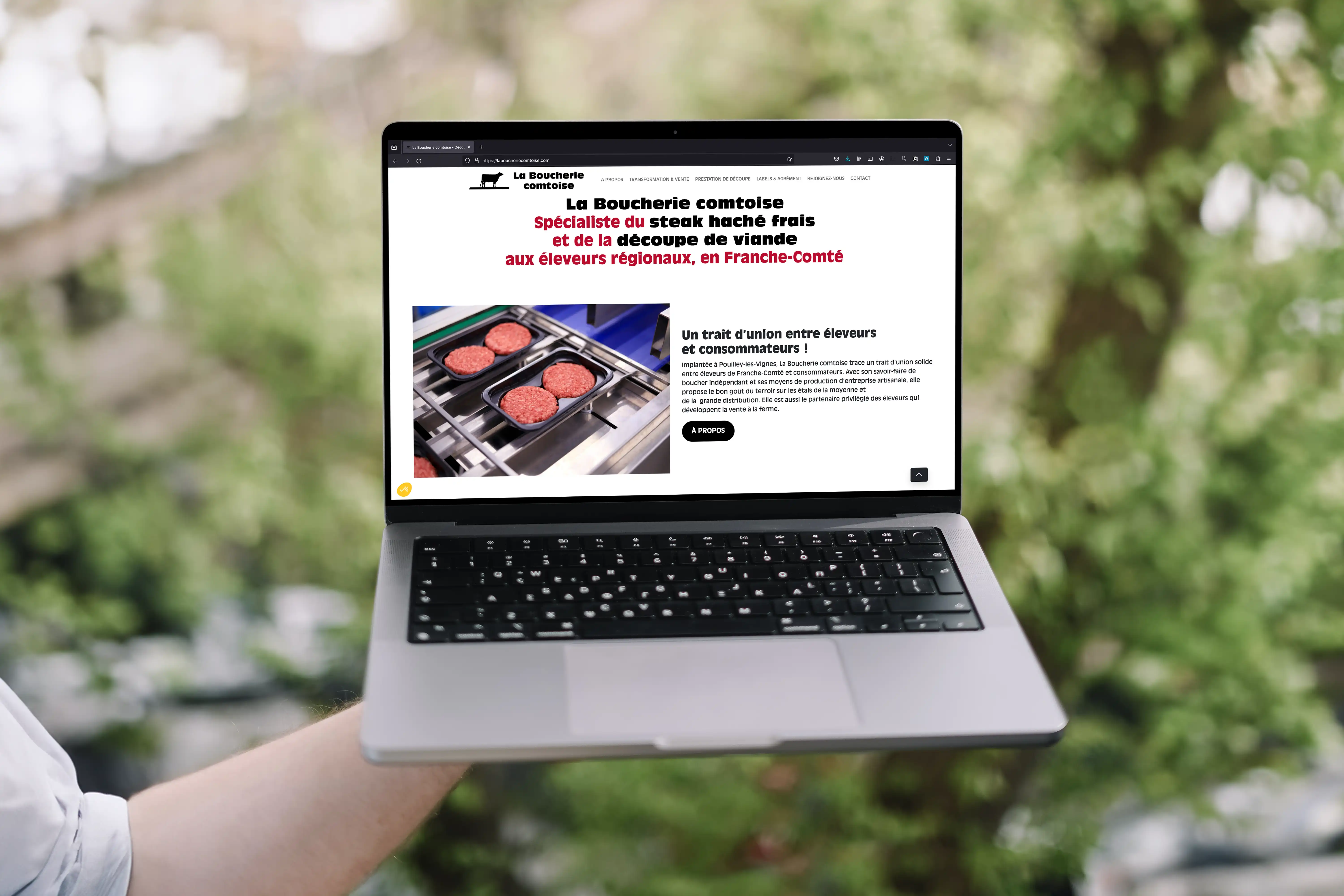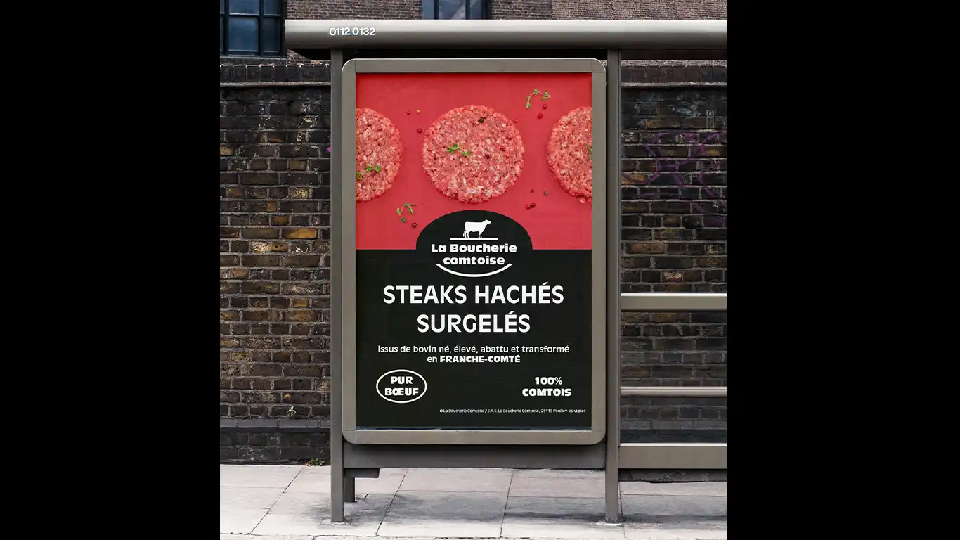 L’identité visuelle de la Boucherie comtoise est construite à partir d’aplat de couleurs, de la typographie Antique Olive et de photographies des produits bruts. L’objectif de cette identité est de montrer la simplicité entre le producteur et le consommateur ainsi que la transparence de cette petite entreprise locale, en montrant une viande de qualité.