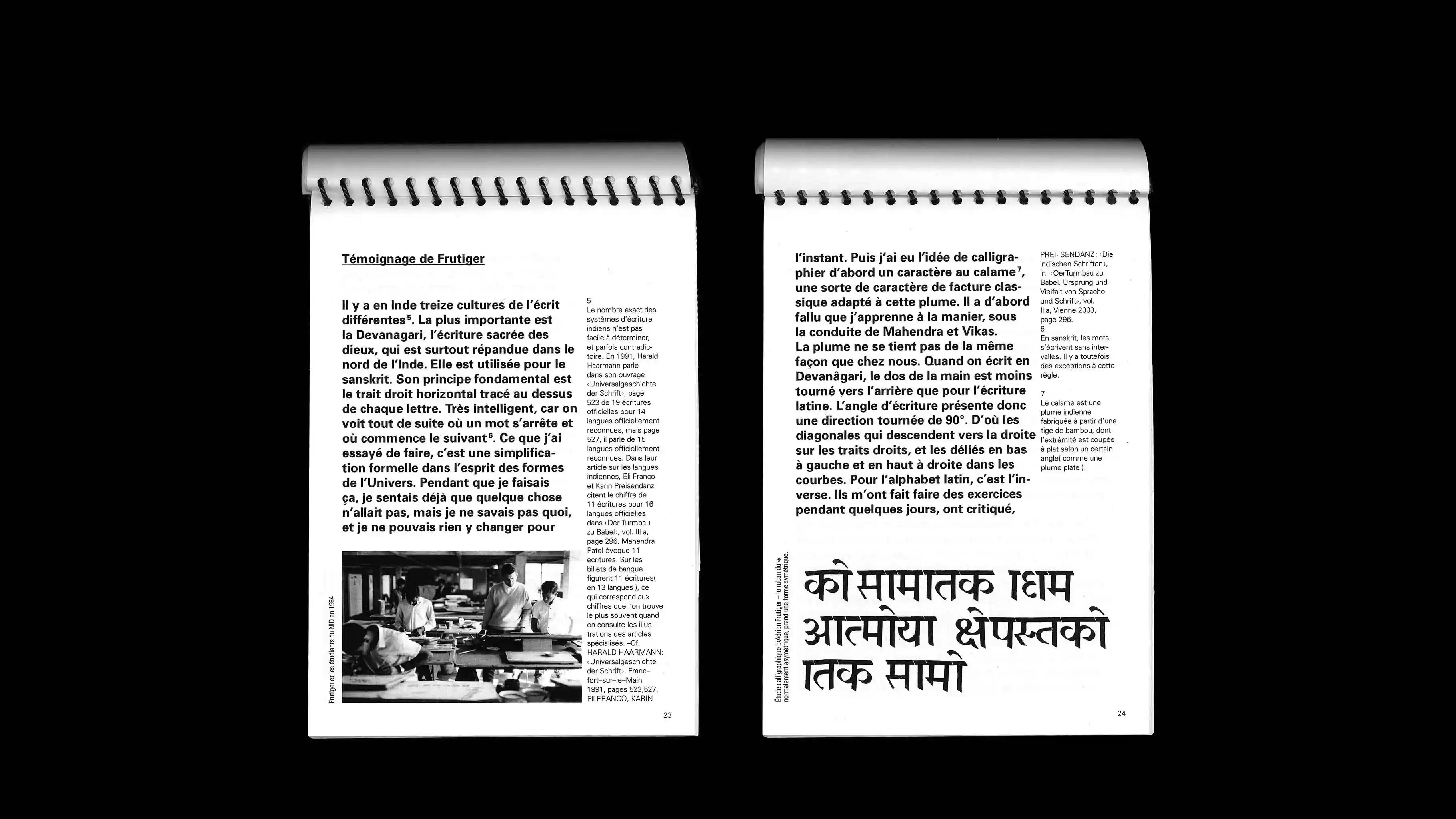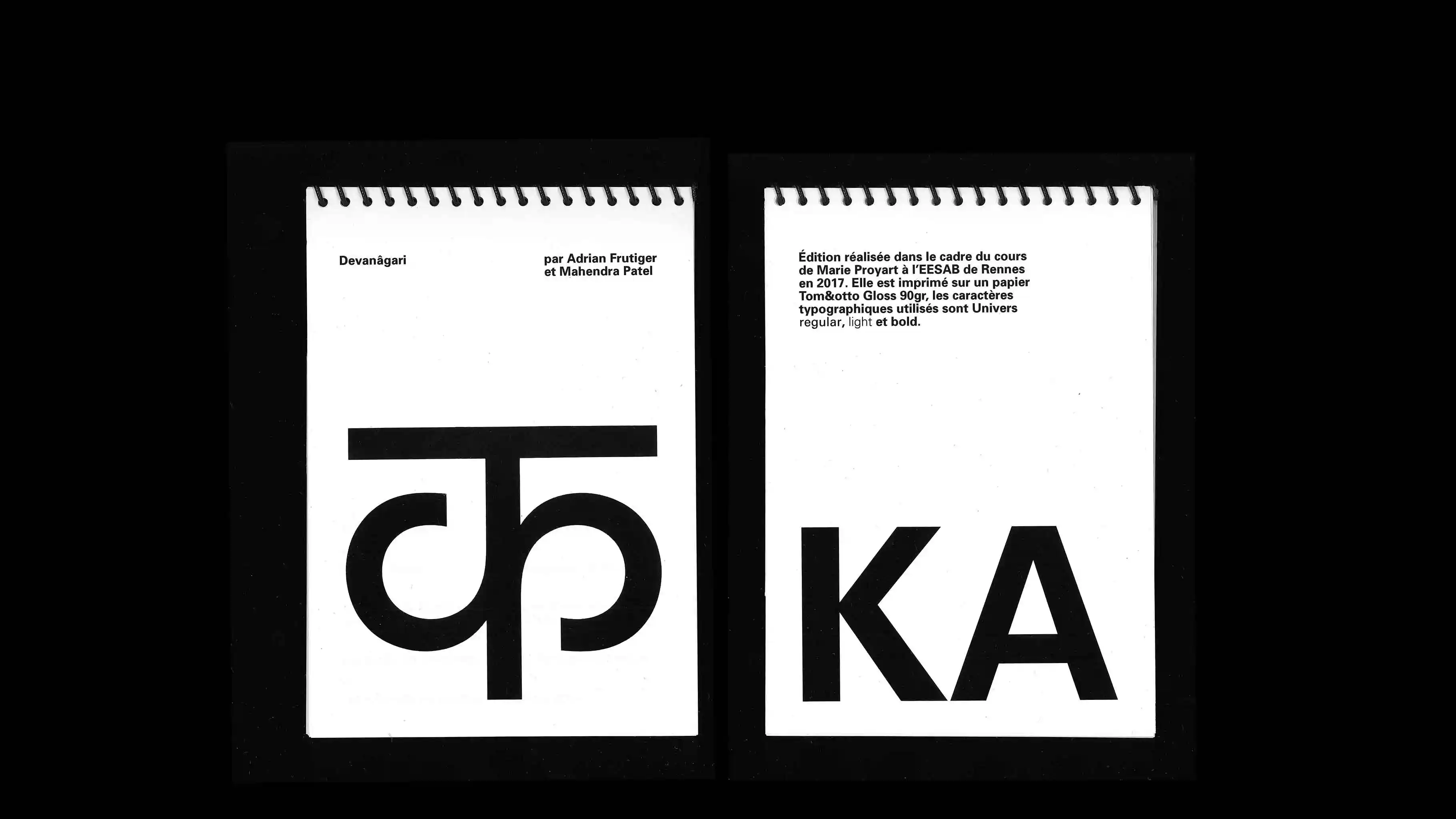 Devanâgari est une édition qui met en lumière le voyage d’Adrian Frutiger en Inde, dans les années soixante-dix. Il transmet ces connaissances dans une école de design et y rencontre Mahendra Patel, étudiant en dessin de caractère qui grâce à l’enseignement de Frutiger dessine une typographie indienne « Devanâgari ».