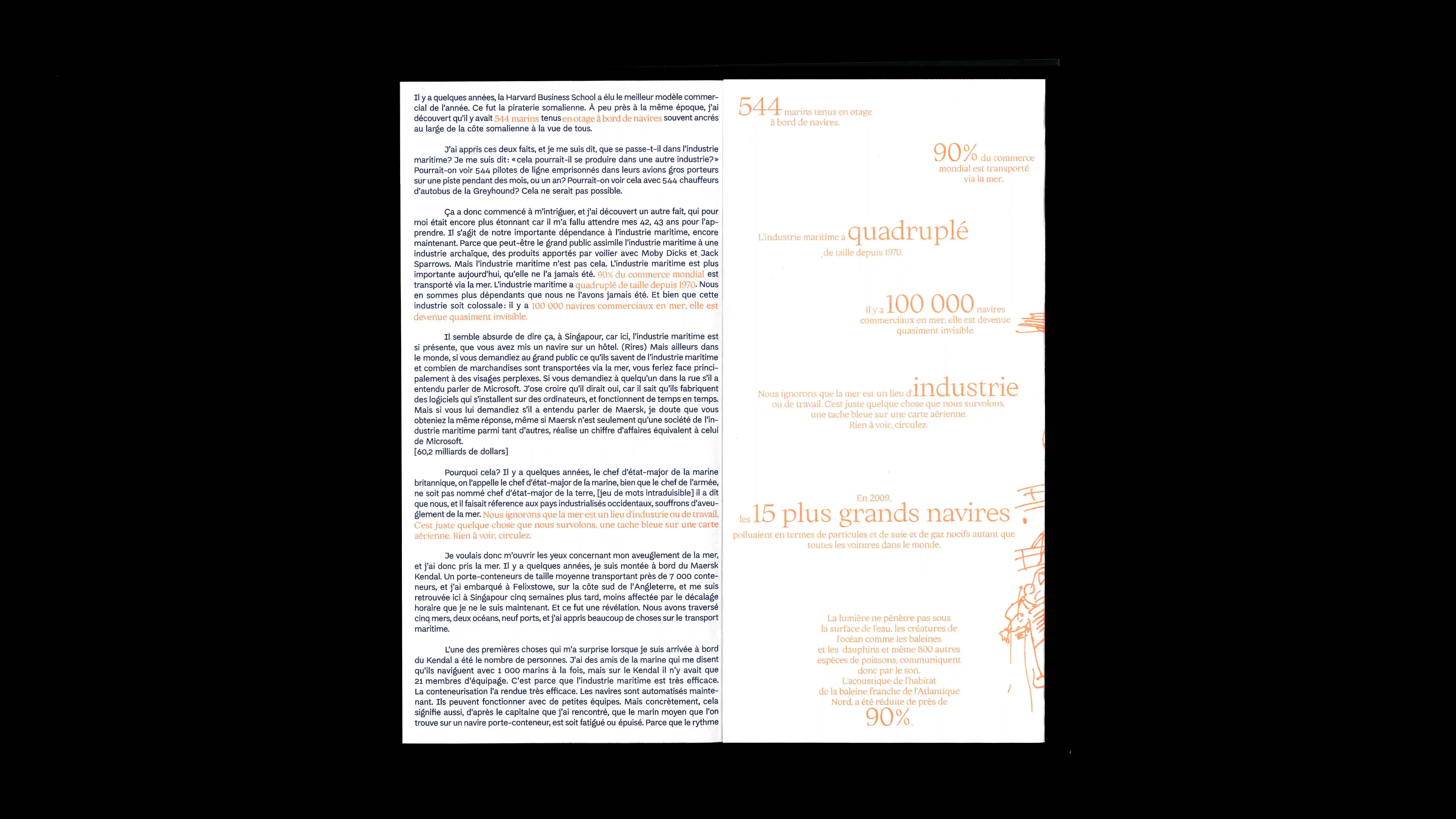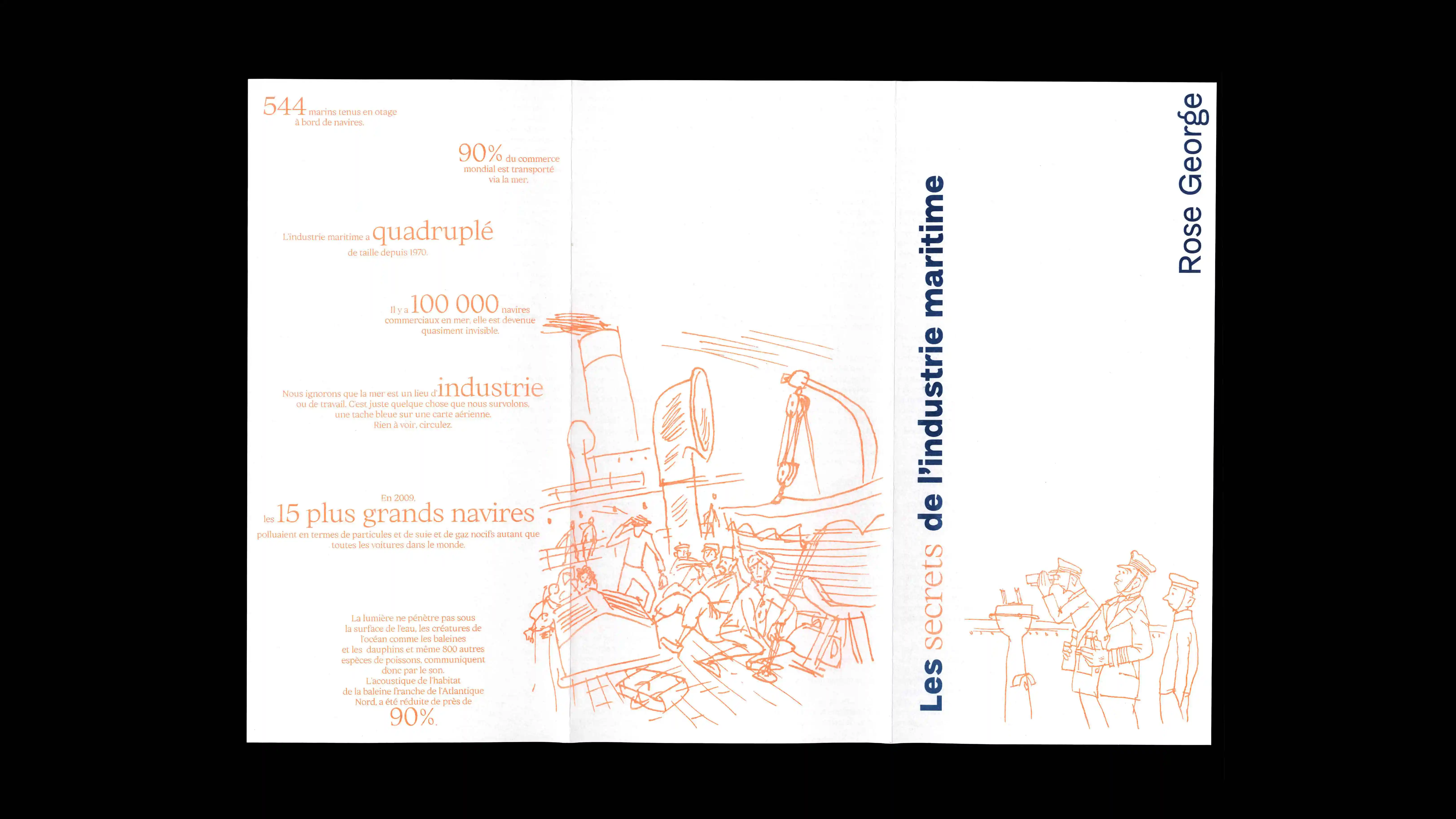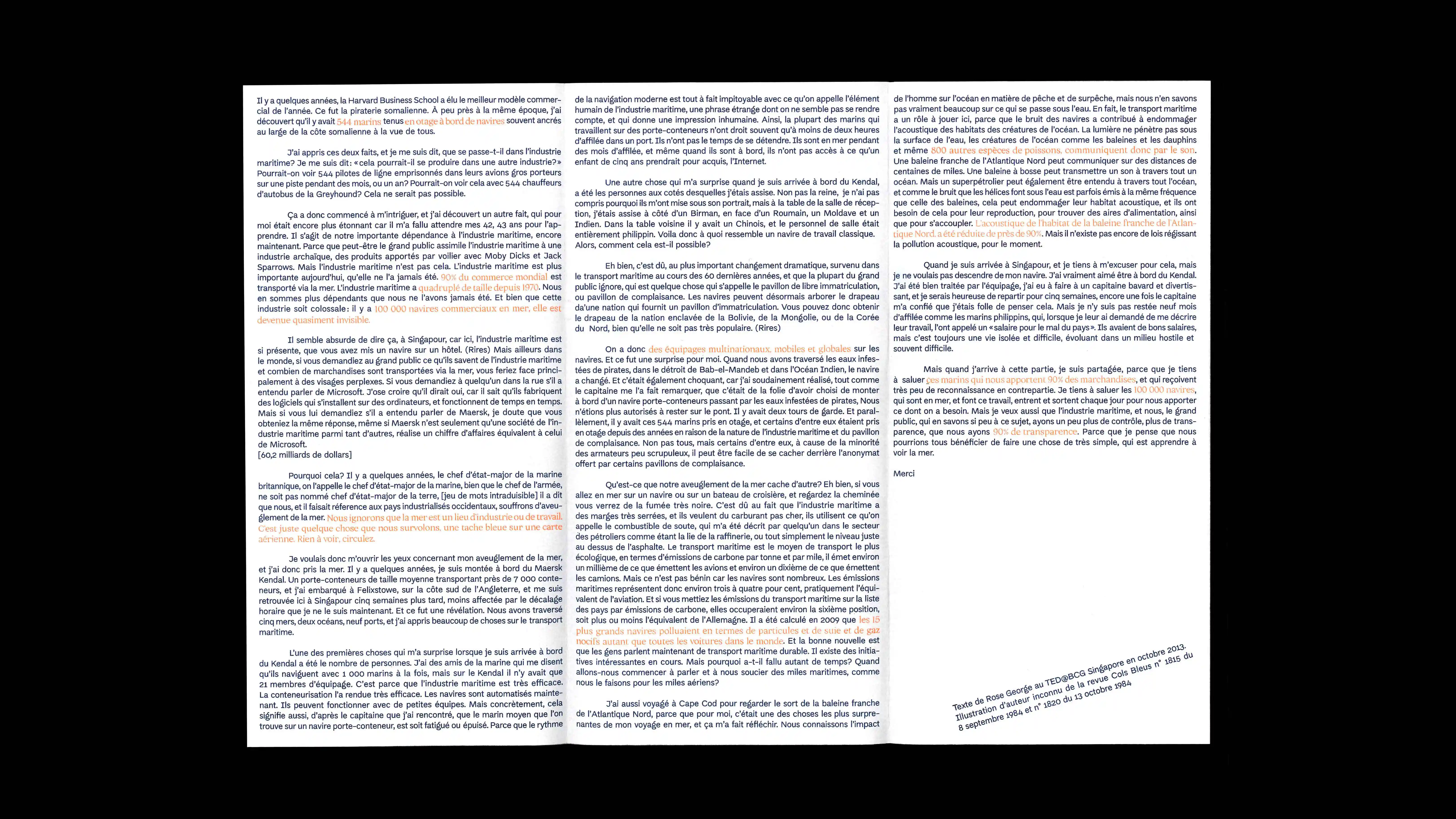 Rose George, journaliste, fait un état des lieux de l’industrie maritime dans sa conférence retranscrite dans l’édition. Le texte est mis en lien avec des illustrations glanées dans la revue Col Bleu, revue spécialisée des marins. Elles sont toutes méconnues dans grand public.