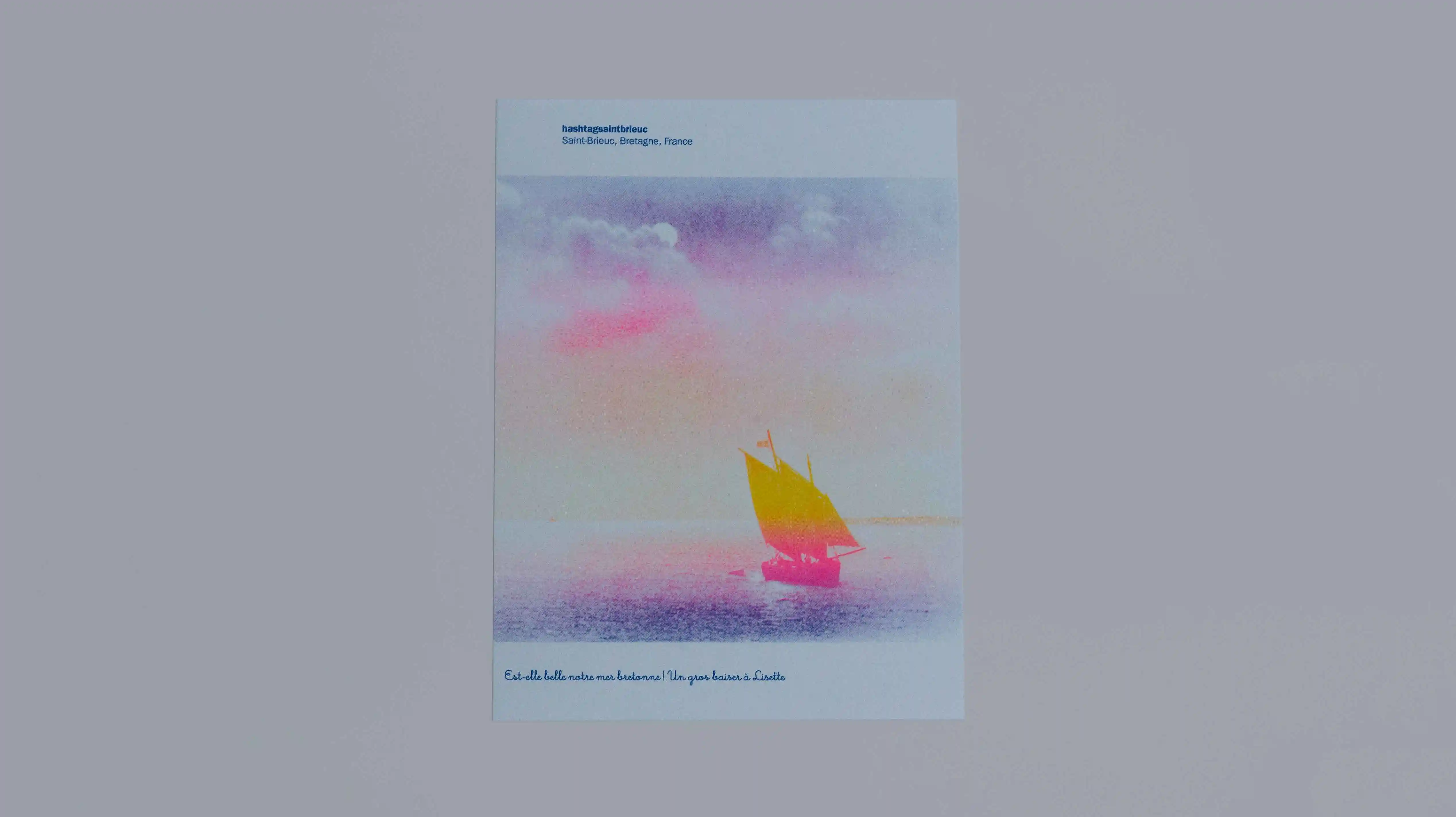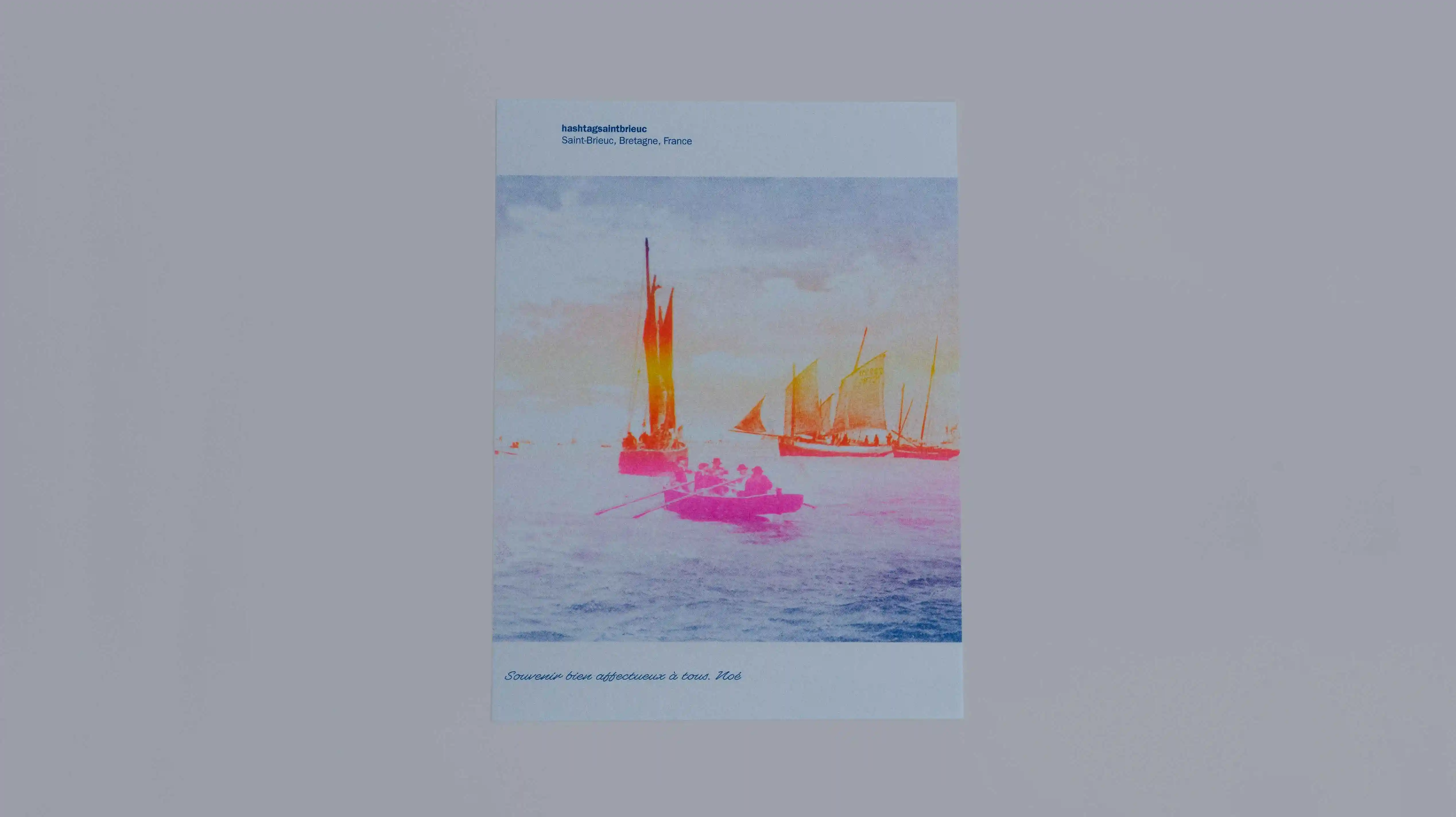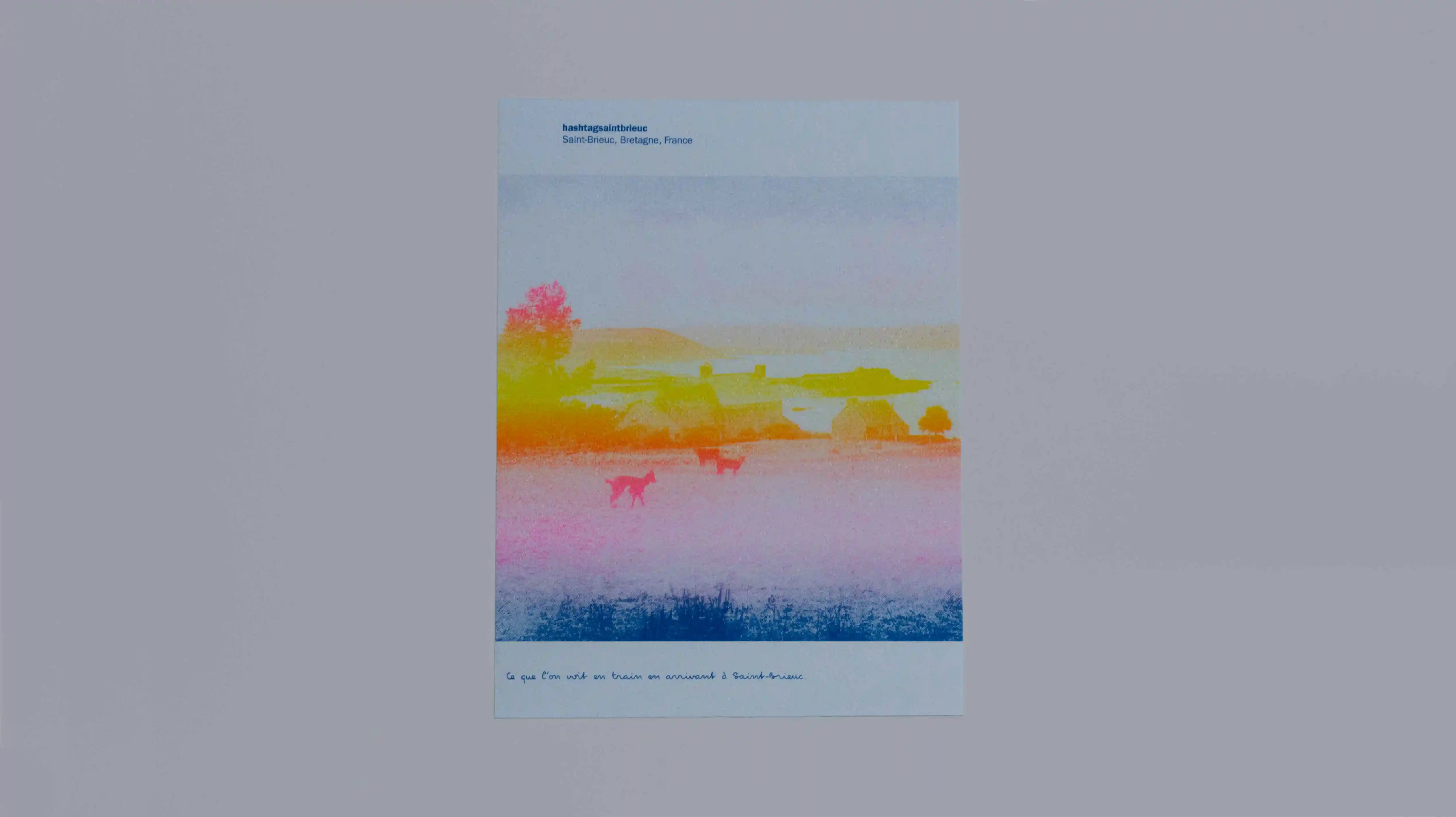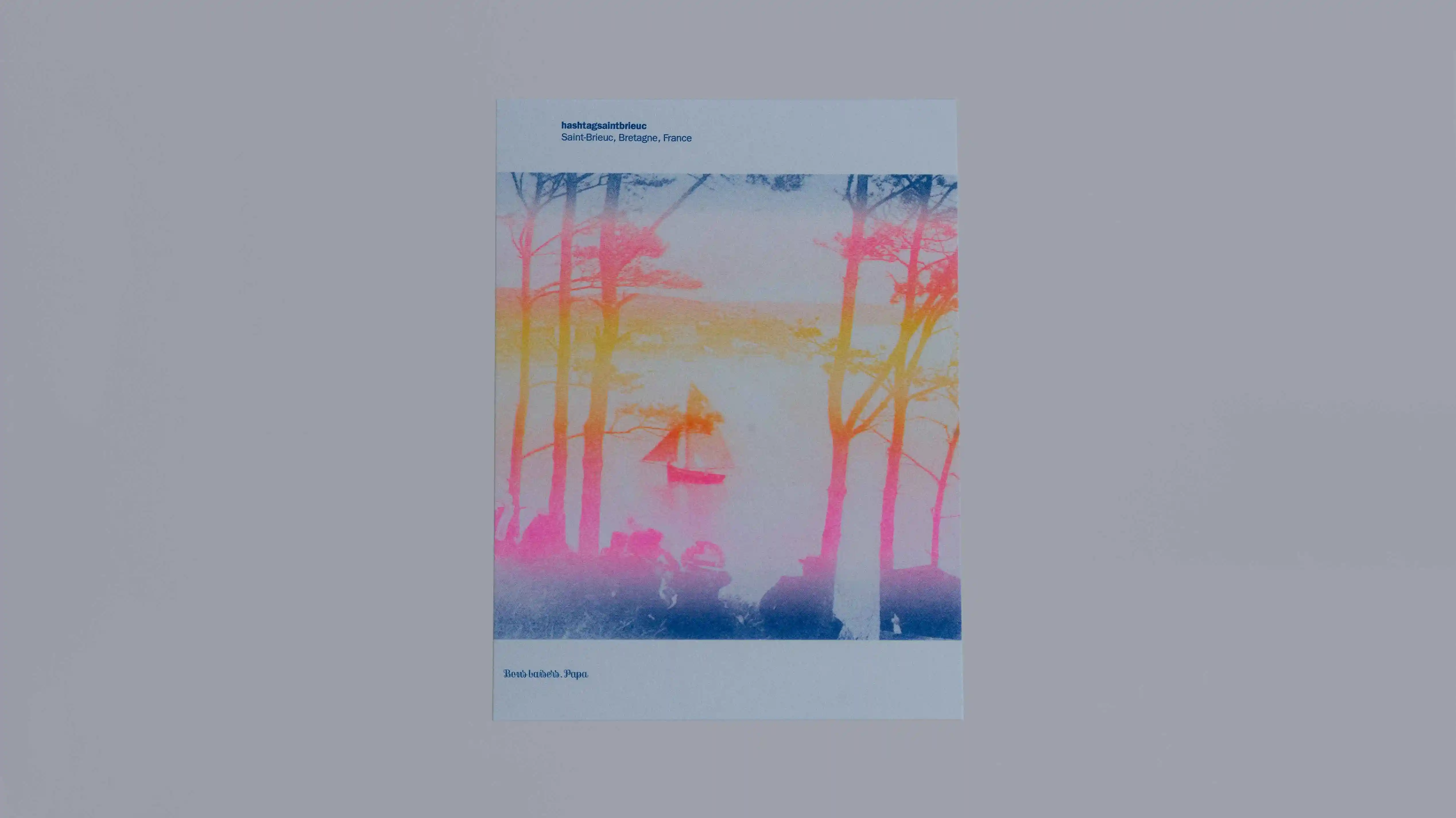 Affiches serigraphiées qui mêlent archives de cartes postales et couchers de soleil glanés sur Instagram.
