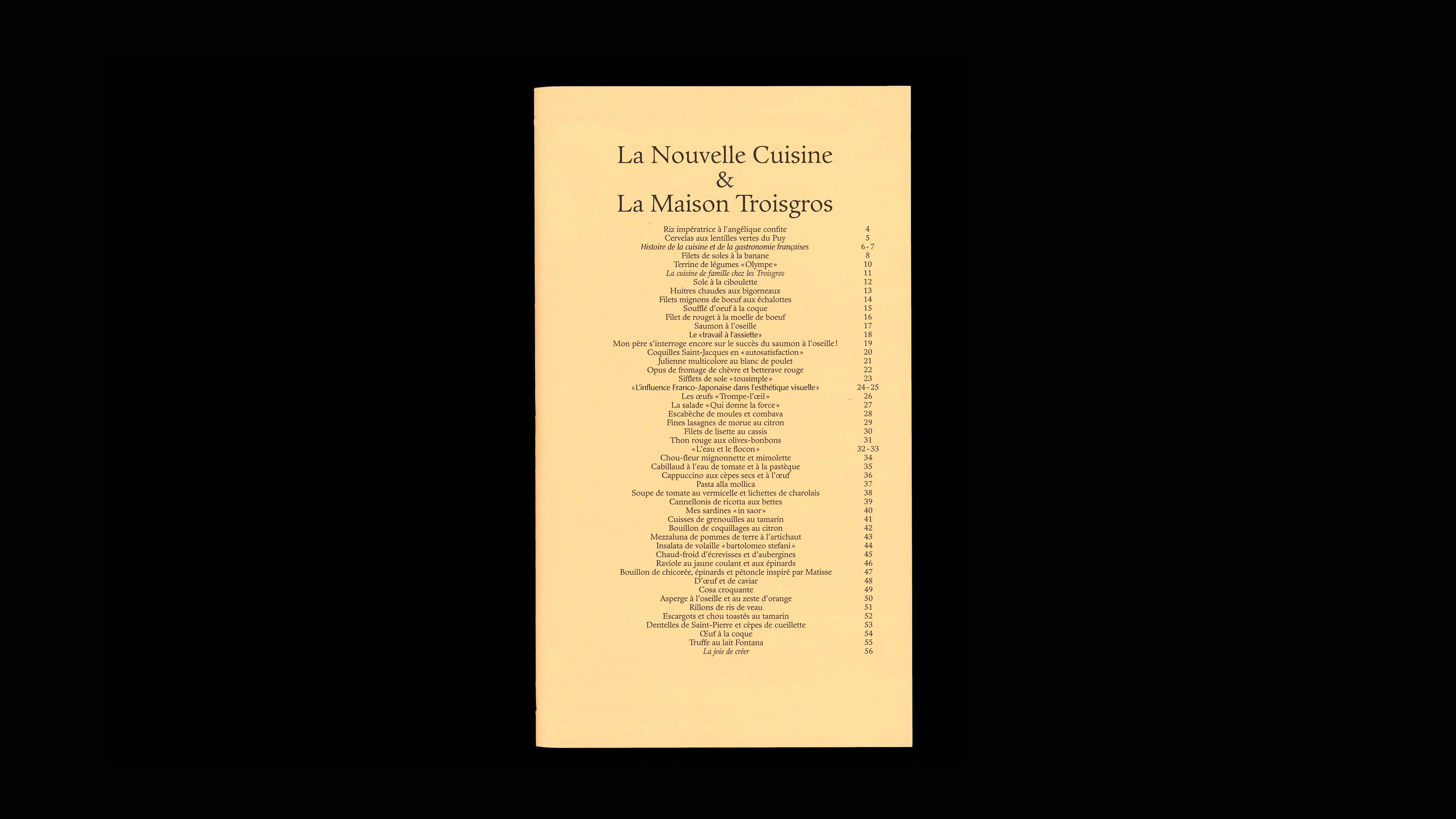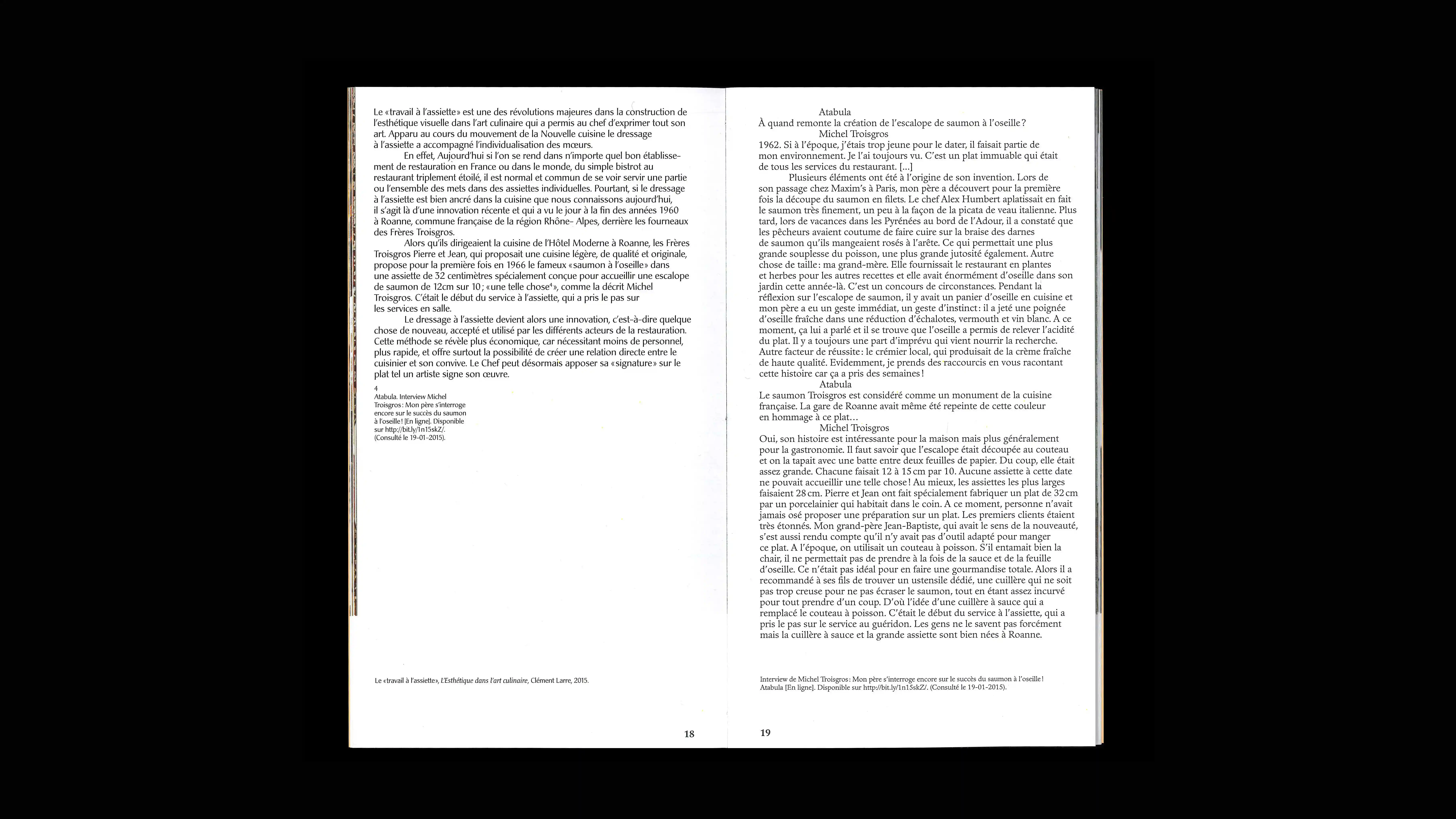 L’édition raconte l’histoire de la famille de chefs étoilés de la Maison Troigros à travers leur plat. Elle évoque l’histoire de la grande Cuisine Française. La hauteur et la largeur de l’édition est à l’image de l’évolution de la taille des assiettes dans leur restaurant, puisque les chefs ont été les premiers a faire leurs assiettes sur-mesure pour leur plat mythique : le saumon à l’oseille.